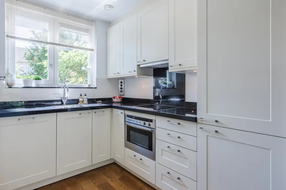 De open keuken bevindt zich aan de voorzijde van het huis. Deze keuken heeft een strak design met witte kastjes en een natuurstenen werkblad. Je treft hier de volgende apparatuur aan: vaatwasser, kookplaat, afzuigkap, oven en een koel-/vriescombinatie.