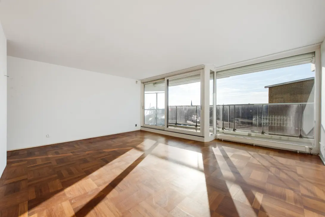 Een royale woonkamer met grote raampartij, dus heerlijk licht en natuurlijk een groot balkon (maar liefst 6.19m breed) op het zuid-westen, waar je de hele dag van de zon en het fraaie uitzicht kunt genieten. Verder is er op dit moment 1 grote slaapkamer. Indien gewenst kan de keuken naar de woonkamer worden geplaatst, zodat je 2 slaapkamers krijgt. Op de parterre is er een eigen berging.