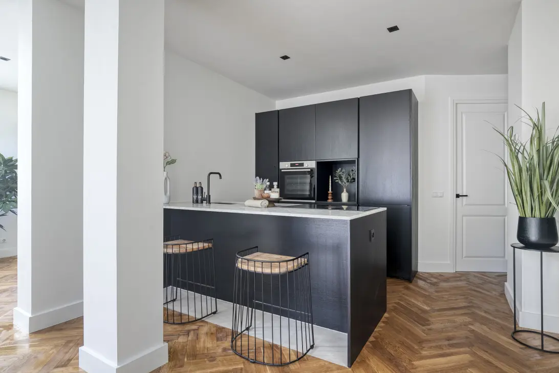 Via de entree bereikt u de centrale hal, die toegang biedt tot alle vertrekken en direct rust en overzichtelijkheid uitstraalt. De royale woonkamer met open keuken vormt het kloppend hart van de woning. Hier is alle ruimte voor een comfortabele zithoek én een grote eettafel, perfect voor lange avonden met vrienden of ontspannen momenten. De luxe open keuken is uitgerust met inbouwapparatuur en een Bora ingebouwde afzuiginstallatie. In de gehele woning ligt een mooie houten visgraatvloer en vloerverwarming.