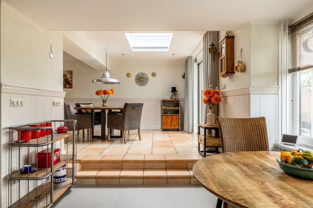 De keuken vormt het hart van de uitbouw en is pas twee jaar oud. Deze L-vormige keuken is uitgerust met oven, inductiekookplaat, koelkast en een perfect werkende recirculatiekap. Slim detail: de zogenaamde 'pindakast', een handige uittrekbare kast waar je alles overzichtelijk in kwijt kunt. Hier ligt elektrische vloerverwarming onder de tegelvloer. Via de keuken bereik je de serre – een fijne tuinkamer met fundering, extra dakramen en zicht op het groen. Alle ruimte dus nog om eventueel nog verder uit te bouwen ;)