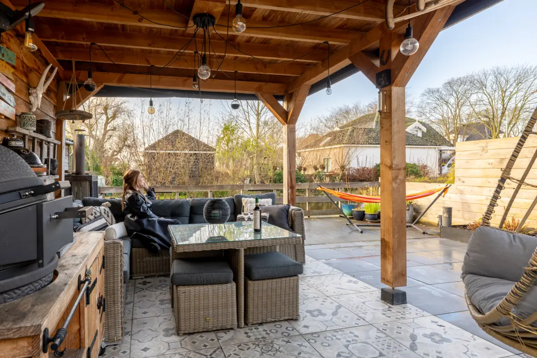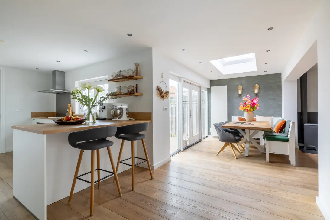 De ruime hal verwelkomt je met een handige trapkast en een modern toilet. Vanuit hier loop je de lichte woonkamer in, met grote raampartijen die zorgen voor een fijne verbinding met buiten. De sfeervolle openhaard geeft warmte en karakter, maar ook via de vloerverwarming heb je altijd een comfortabel klimaat in huis. Via de eethoek, perfect gepositioneerd voor lange diners en gezellige borrels, kom je in de halfopen keuken, compleet met inbouwapparatuur. Vanuit de keuken is ook de garage/bijkeuken bereikbaar. Hier zul je 9 van de 10 keer binnen komen lopen om je tassen neer te zetten en je jas en schoenen uit te trekken. Zo wordt deze ruimte een ideale ruime hal waar je alles makkelijk kunt bergen.