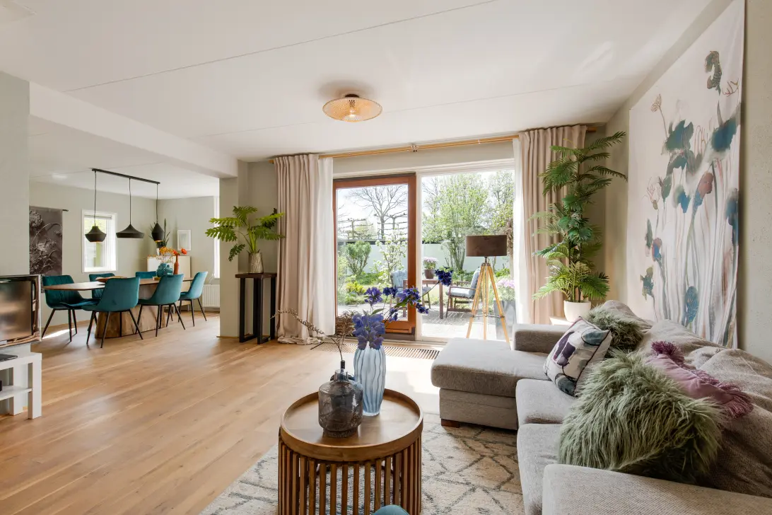 • Grote woonkamer met schuifpui en open keuken aan voorzijde;