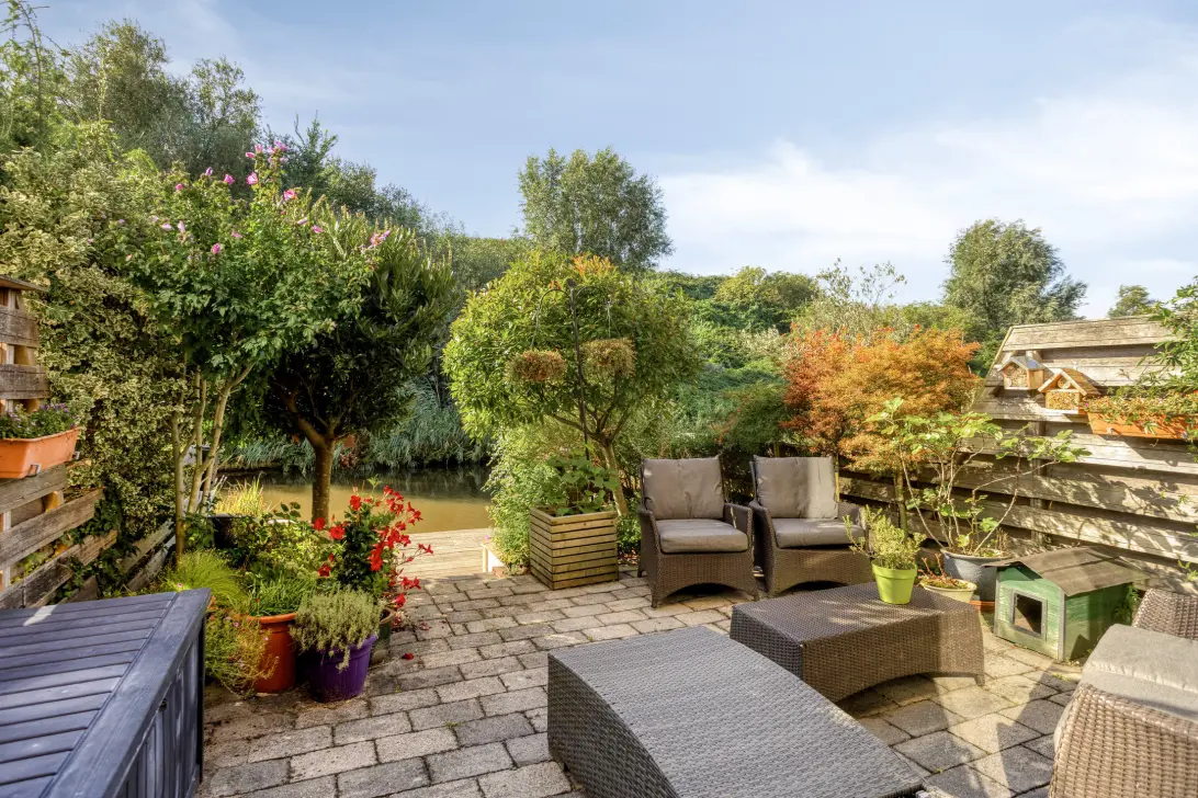 Dat is fijn, je kunt parkeren op eigen terrein! Voor de garage is genoeg plek voor de auto, en voor een tweede auto is plek langs de openbare weg. De achtertuin is, net als het dakterras, gesitueerd op het zonnige zuiden. Het terras bij de woonkamer is een fijne plek om van de zon, én van het uitzicht te genieten. En het terras aan het water? Perfect om te zonnen, loungen, vissen en om een bootje aan te leggen?