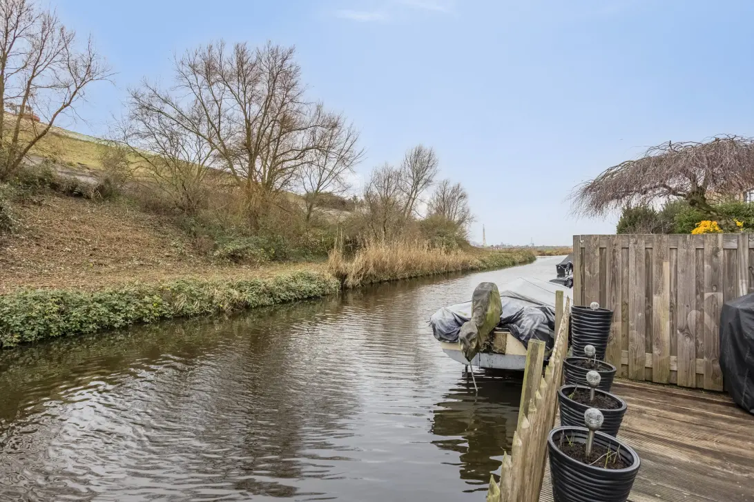 Achter de diepe woonkamer bevindt zich een beschutte achtertuin op het zuiden en aan vaarwater, met een steiger voor het aanleggen van een bootje. Het open vaarwater geeft de mogelijkheid koers te zetten naar het natuurgebied het Westzijderveld of in rechte lijn naar Amsterdam.