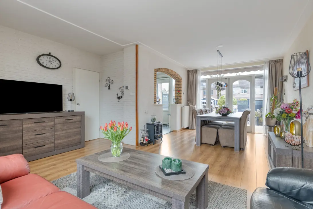 De ruime L-vormige woonkamer is uitgerust met een praktische trapkast, glad stucplafond, airco, laminaatvloer en openslaande tuindeuren naar de zonnige achtertuin. De nette half open hoekkeuken is voorzien van een vaatwasser, koelkast, inductie kookplaat en afzuigkap.