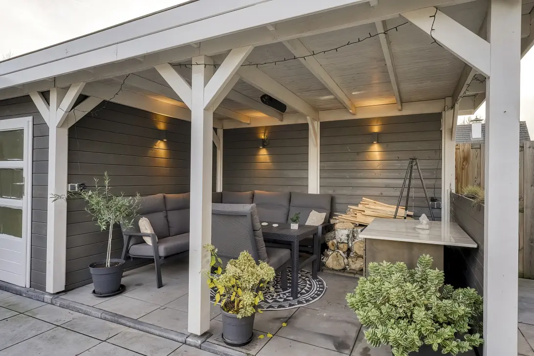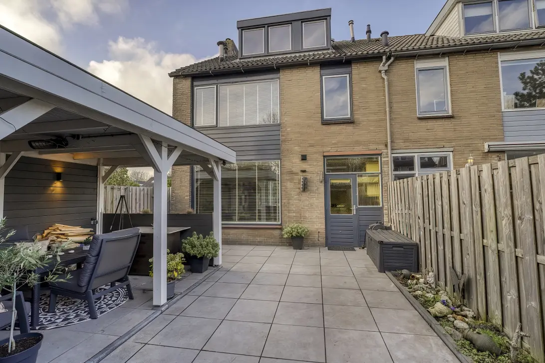 De tuin ligt op het zuidoosten en biedt daardoor veel zon. Dankzij de overkapping met heater kunt u ook op koelere avonden comfortabel buiten zitten. Twee bergingen zorgen voor extra opbergruimte. In de houten berging is ook de omvormer voor de zonnepanelen geplaatst die op het dak van de overkapping en berging liggen.