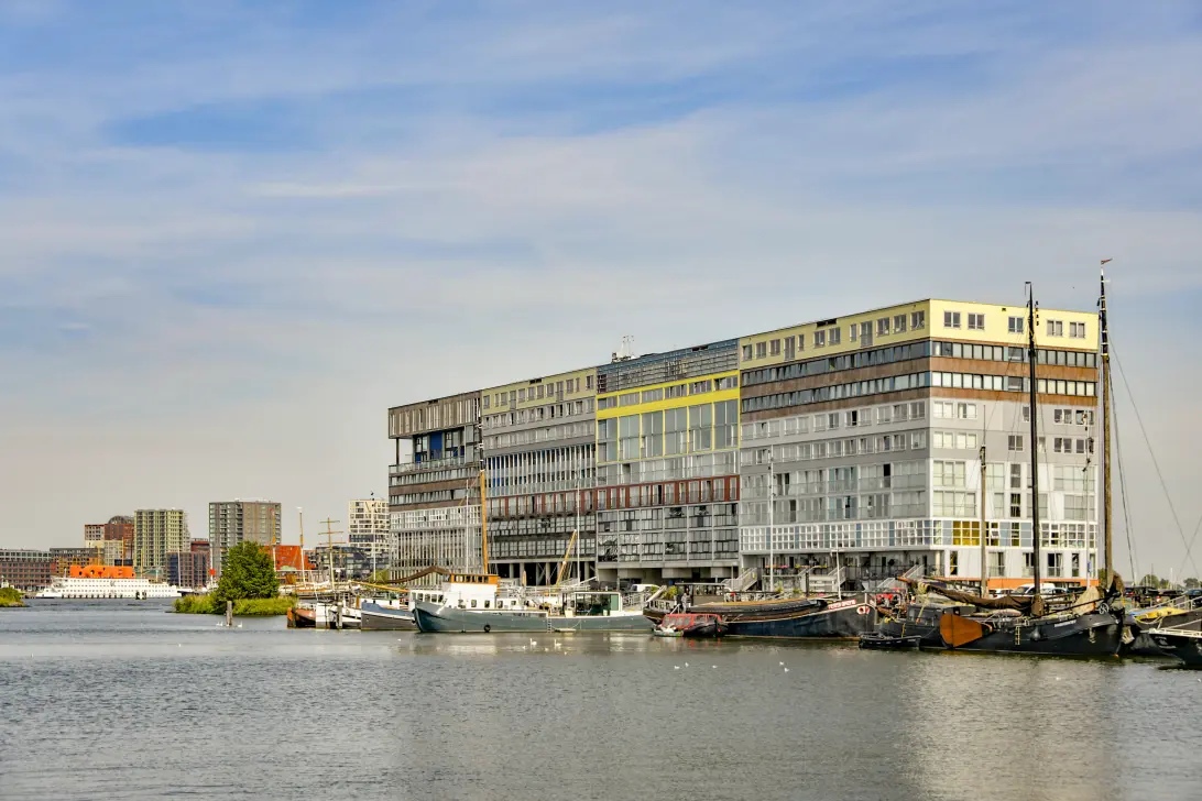 The Silodam is located in the Western Harbour District and serves as a breakwater, extending about 300 meters into the IJ. Along the Silodam are two former grain silos, now converted into residential buildings, including the “Stenen Silo,” a national monument. The Silodam apartment complex, built in 2002, is a well-known example of modern architecture along Amsterdam’s IJ waterfront. On the western side of the Silodam are the Houthavens, and a three-meter-wide wooden boardwalk runs along the full length of the dam. It ends in a staircase that cuts through the new construction to a terrace with panoramic views over the IJ. Once every five years (next in 2025), ‘Sail Amsterdam’ takes place, offering front-row seats to the most beautiful ships passing by.