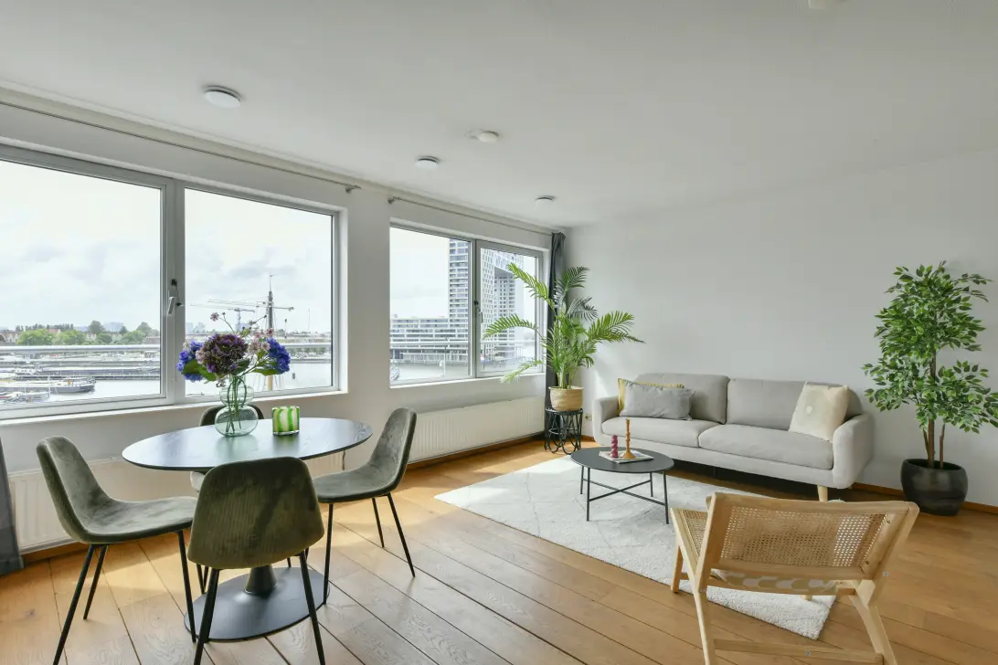 Zeer fijn en ruim appartement van circa 89 m², gelegen op de vijfde en zesde verdieping met schitterend uitzicht op het IJ en de stad, inclusief eigen parkeerplaats en berging!