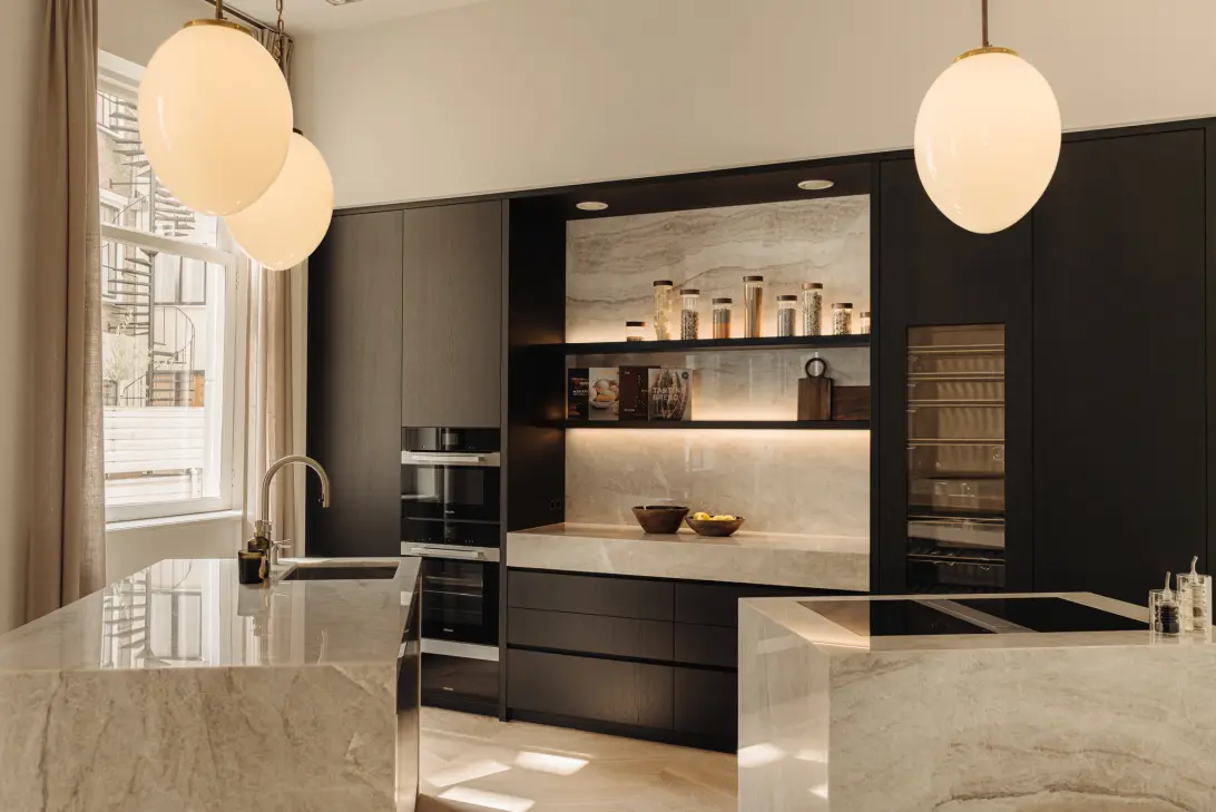 • Built-in appliances from Miele (including wine climate cabinet, double oven, microwave, plate warmer, refrigerator, and freezer), Bora (including induction hob), and the most comprehensive Quooker model;