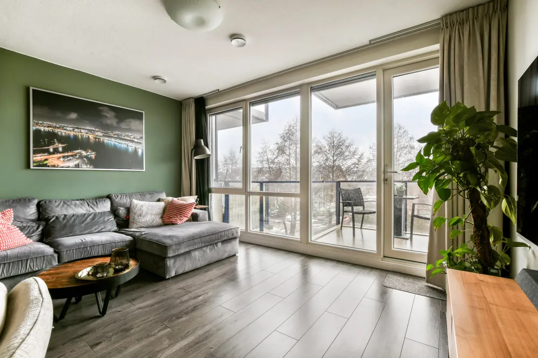 De lichte woonkamer beschikt over een laminaatvloer en een grote raampartij die uitkijkt over de groene omgeving en water. Vanuit de woonkamer heeft u toegang tot het balkon op het westen, waar u in de middag en avond heerlijk van de zon en het vrije uitzicht kunt genieten.