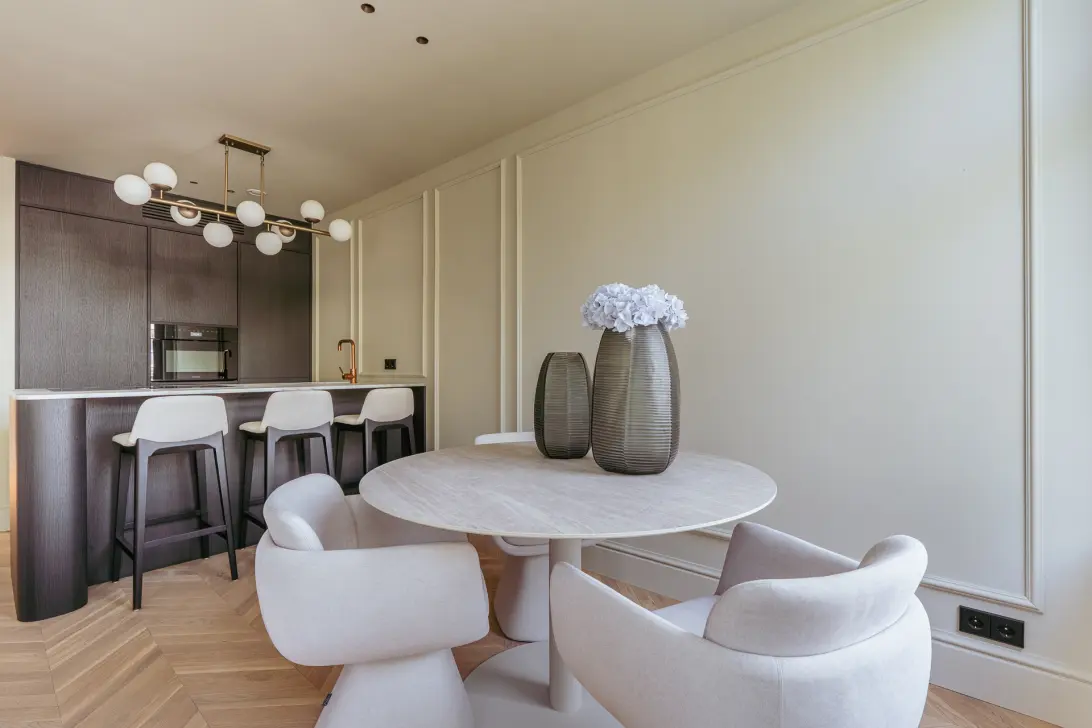 These Italian-chic apartments were recently renovated to the highest standard, with every square meter optimized. Elegant details such as decorative moldings, bespoke doors and cabinetry, and a stunning oak herringbone floor with underfloor heating bring style and comfort together. The property is fully insulated, holds energy label A, and the foundation of the building has already been restored.