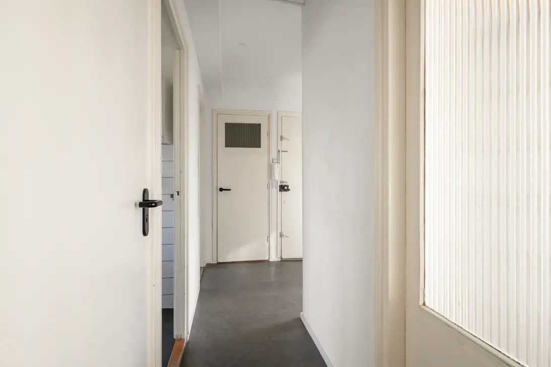 Via het keurig onderhouden gemeenschappelijke trappenhuis bereikt u de derde verdieping, waar het appartement is gelegen. Bij binnenkomst betreedt u de centrale hal, die toegang biedt tot alle vertrekken. Aan de voorzijde bevindt zich de eerste slaapkamer, met directe toegang tot het op het zuiden gelegen balkon. De doorzonwoonkamer strekt zich uit over de volledige lengte van het appartement en biedt dankzij de openslaande deuren toegang tot de loggia aan de achterzijde. Zowel de keuken als de tweede slaapkamer liggen aan de achterzijde van het pand. De badkamer is voorzien van een douche en wastafel, terwijl het toilet zich in een aparte ruimte bevindt.