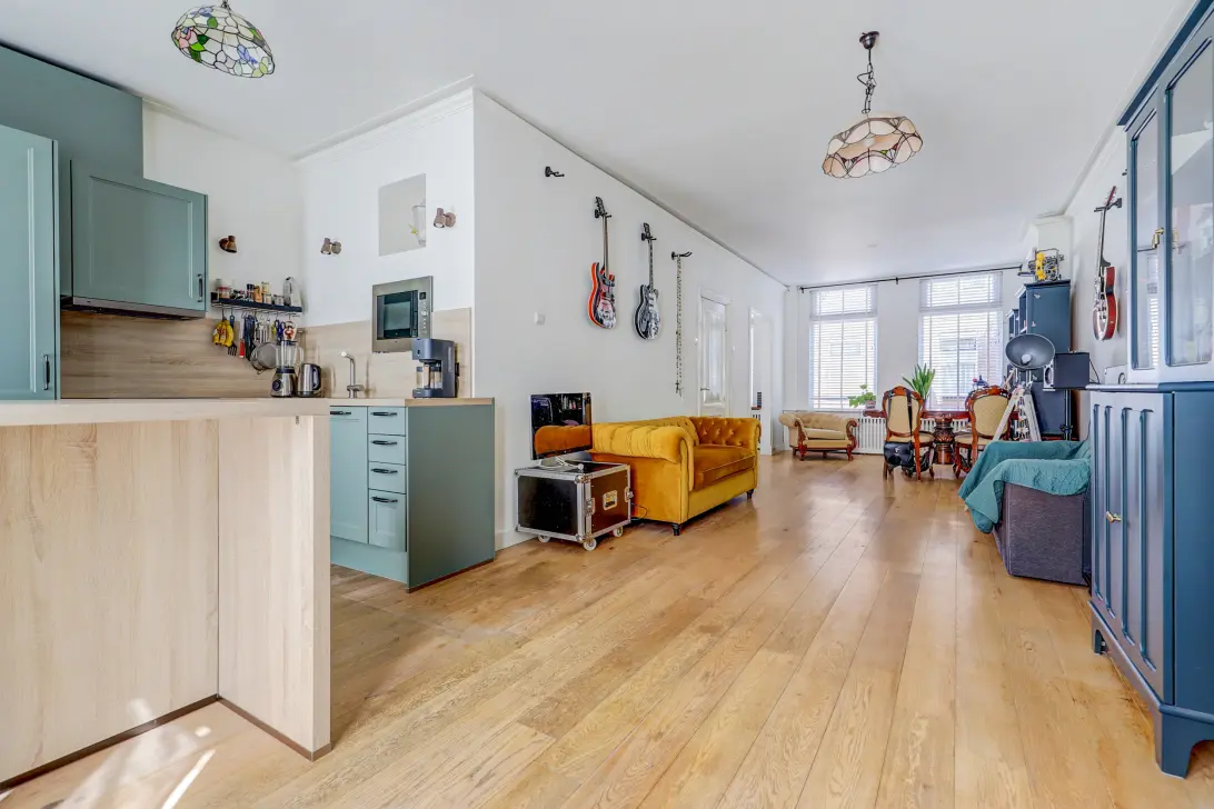 Op de overloop bevinden zich het toilet en de toegang tot de lichte woonkamer met open keuken. De woonkamer ligt aan de voorzijde en beschikt over een aangrenzende zijkamer – ideaal als werkplek, speelruimte of leeshoek.