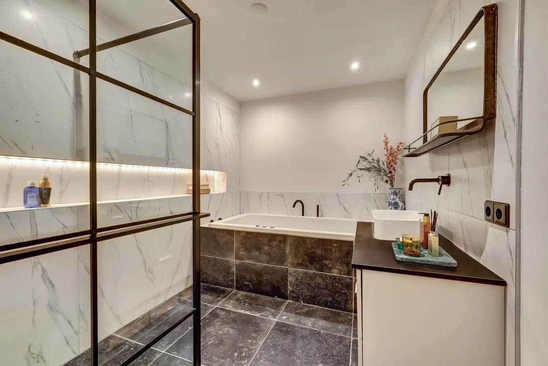 Via een vaste trap bereik je het souterrain met een stahoogte van 2.40m. Hier bevinden zich twee ruime slaapkamers, een kantoorruimte, de badkamer, een praktische wasruimte en vaste kastenwand. De slaapkamers zijn ruim, licht en praktisch ingedeeld. De masterbedroom heeft een inloopkast. De luxe badkamer is gerealiseerd in 2018 en voorzien van een inloopdouche met regendouche en een bad met whirlpool. Door de lengte van de woning en de rustige ligging aan de Sloetstraat is dit een heerlijke verdieping voor slapen, werken of studeren. Verder is de temperatuur het gehele jaar aangenaam, zomers koel en ’s winters verwarmd door de vloerverwarming.