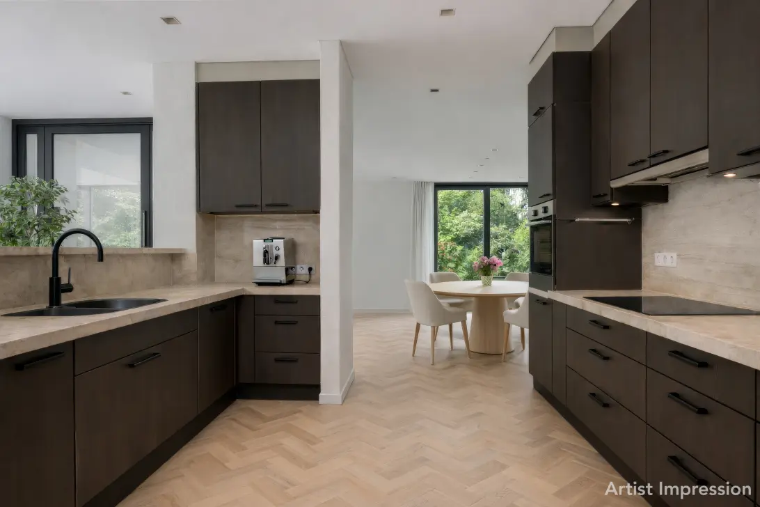 BEGANE GROND: Aan de voorzijde is de overdekte entree, die toegang geeft tot de fraaie ontvangsthal met garderobe. Aan de rechterzijde bevindt zich het ruime gastentoilet met fonteintje. De zonnekamer, woonkamer en eetkamer vormen samen een fantastische leefruimte van circa 86 m2. In de zonnekamer en zitkamer zijn gashaarden geplaatst en onder de prachtige tegelvloer ligt vloerverwarming. Geniet van de lichtinval en het fraaie uitzicht naar de tuin, die u via meerdere schuifpuien kunt bereiken. Aan de zonnekamer en eetkamer grenst de keuken met aangrenzende bijkeuken. De op maat gemaakte keukenopstelling biedt veel bergruimte en de aanrechtbladen zijn, net als de achterwanden, uitgevoerd in marmer. De inductie kookplaat, afzuigkap, oven, vaatwasser, Quooker en een warmhoudlade zijn ingebouwd. De bijkeuken met de witgoedopstelling staat in verbinding met de dubbele garage (ca. 32 m2). Deze exclusieve villa biedt de mogelijkheid om gelijkvloers te wonen. De royale slaapkamer heeft aan twee kanten prachtig uitzicht naar de tuin en de aangrenzende badkamer is ingedeeld met een inloopdouche, dubbel wastafelmeubel, wandcloset en meerdere vaste kasten.