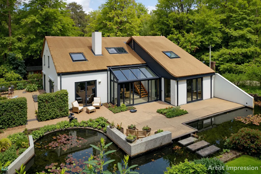 TUIN: De villa wordt omringd door een prachtige landschapstuin met een grote vijver, die u vanuit de villa volop kunt bewonderen. De oprijlaan naar de garage, de gevarieerde beplanting, hoge bomen en grote terrassen zorgen ervoor dat deze villa exclusiviteit uitstraalt. In de royale houten berging is ruimte voor een atelier en het tuingereedschap en op een verscholen plek bevindt zich een oude bunker.