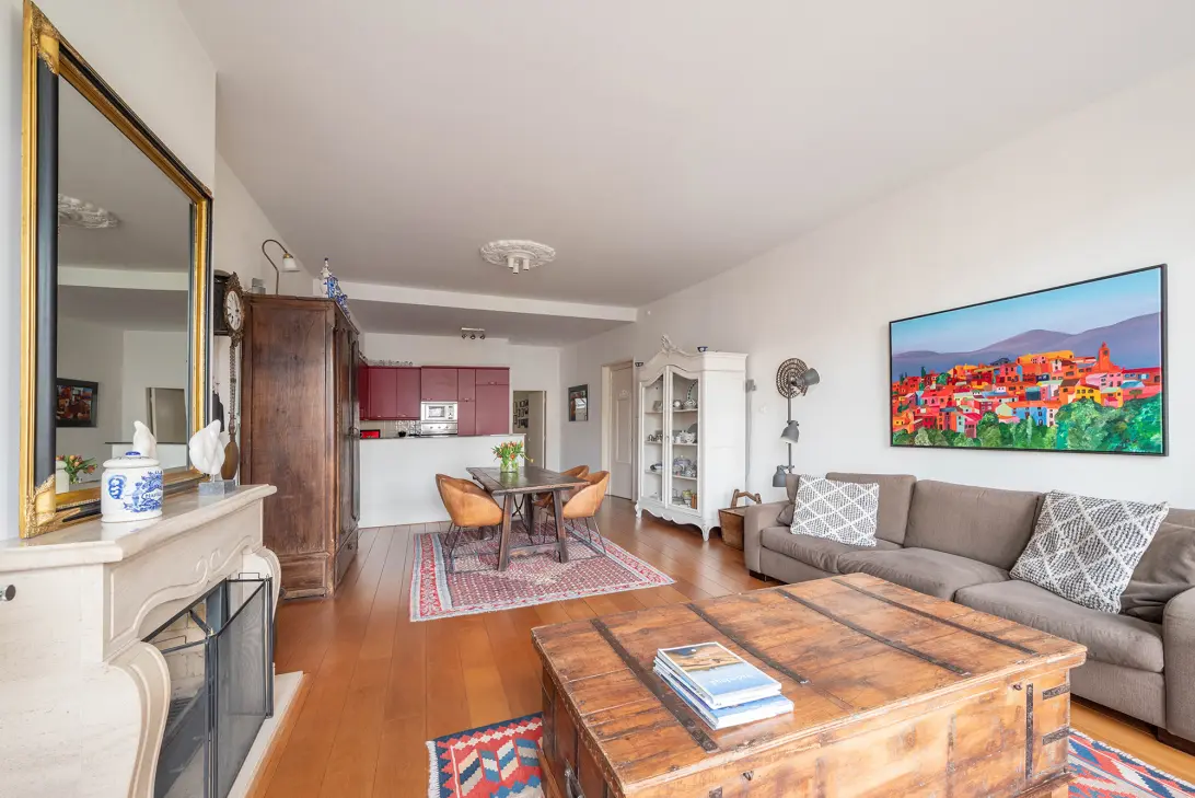 1st floor: Fully equipped with parquet flooring, entrance to apartment, very spacious living room (approx. 50 m2) with high ceiling (3.20m) and plenty of natural light, parquet flooring, and fireplace. Modern open kitchen with various built-in appliances. Hallway with access to bathroom with double sink, shower, bathtub, and washer/dryer connection. 2 spacious bedrooms, one (totally isulated) with access to a small balcony (SE) and one with a large walk-in closet.