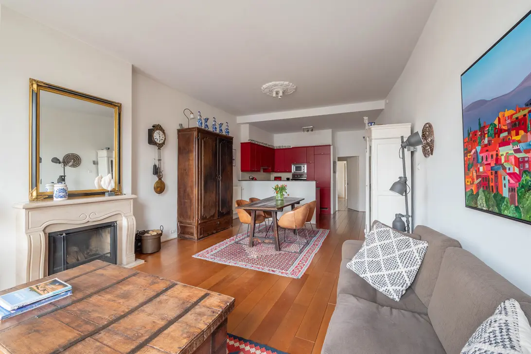 1e etage: (geheel voorzien van parketvloer) entree appartement, zeer royale woonkamer (ca 50 m2) met hoog plafond (3.20) en heel veel lichtinval, parketvloer en open haard. Moderne open keuken met allerhande inbouwapparatuur. Gang met toegang tot badkamer met dubbele wastafel, douche, ligbad en wasmachine-/droger aansluiting. 2 ruime slaapkamers, waarvan 1 (totaal geïsoleerd) met toegang tot klein balkon (ZO) en 1 met grote inloopkast.