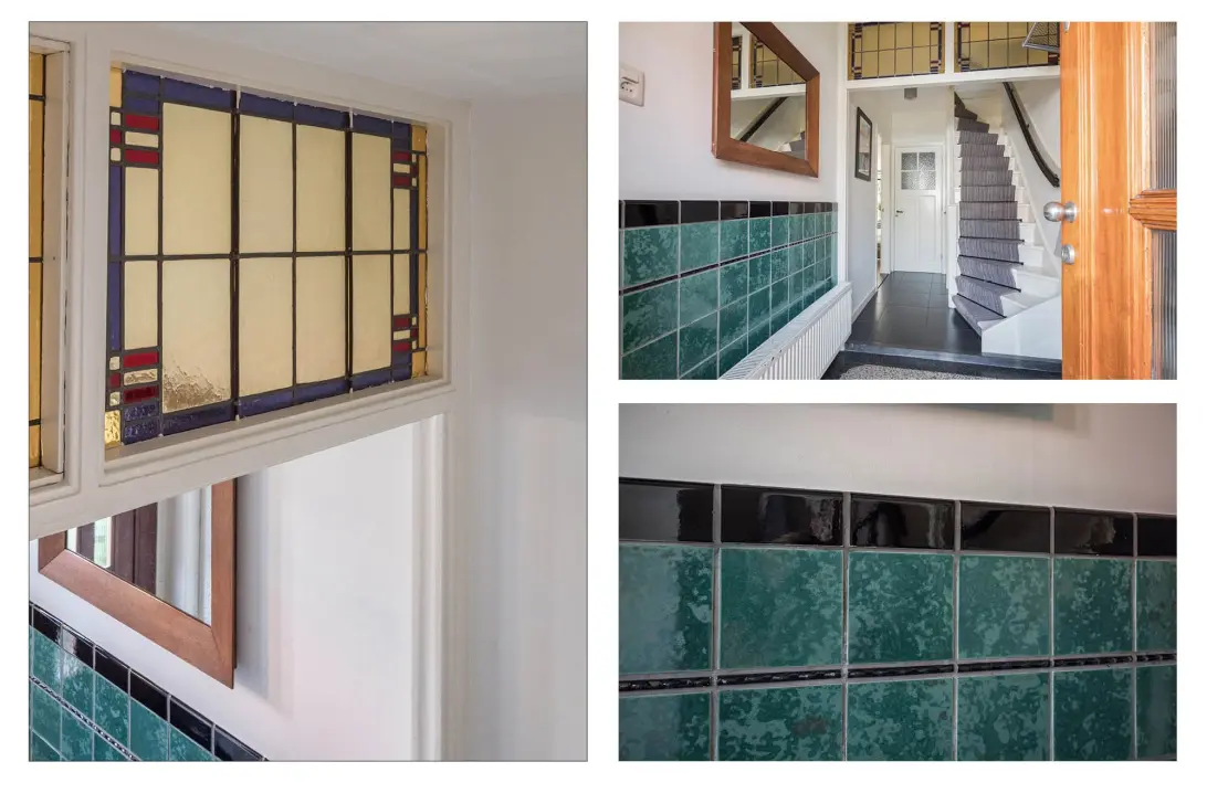 Front garden, entrance, vestibule with fuse box, original terrazzo flooring and wall tiles, hallway, stairwell/storage closet, modern toilet with washbasin, extended living room with bay window and stained-glass windows. At the front, a luxury kitchen with cooking island and various built-in appliances including a Quooker, dishwasher (Bosch), gas hob (Atag) with preparation for induction, extractor hood, 6-drawer freezer and refrigerator (Liebherr), combination microwave and convection oven (Bosch).