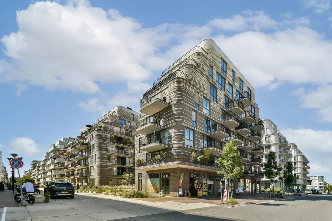 Designed by renowned Orange Architects, The Bow is inspired by the timeless elegance of Paris, with its curved lines and seamless blend of indoor and outdoor spaces. The result is a building that captures the essence of Southern European living, right on the IJ waterfront. Constructed between 2021 and 2024, the complex features modern sustainability standards including underfloor heating and cooling via Thermal Energy Storage (TES), a Heat Recovery Ventilation system, and maintenance-free bronze-colored aluminum window frames.