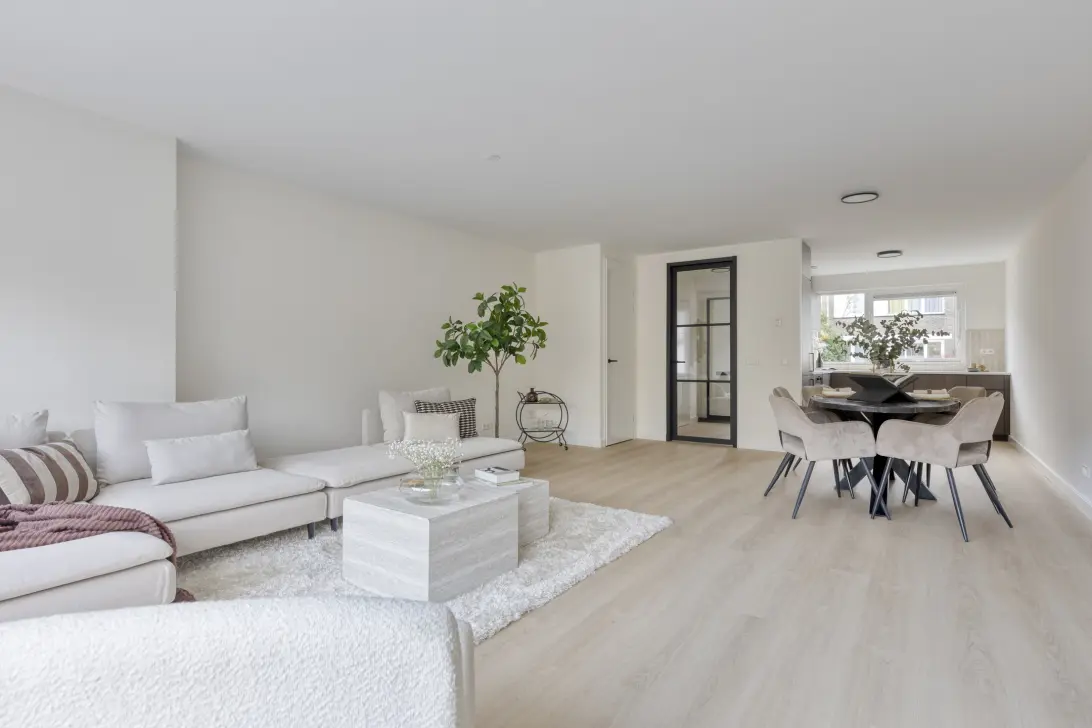In 2025 is werkelijk alles vernieuwd: keuken, badkamers, vloeren, wanden, plafonds, installaties en kozijnen. De woonkamer is met twee meter uitgebouwd, wat zorgt voor een royale leefruimte met veel licht en een open karakter. De moderne zwarte stalen deur geeft de woning een eigentijdse uitstraling, terwijl de begane grond is voorzien van vloerverwarming en strakke afwerking.