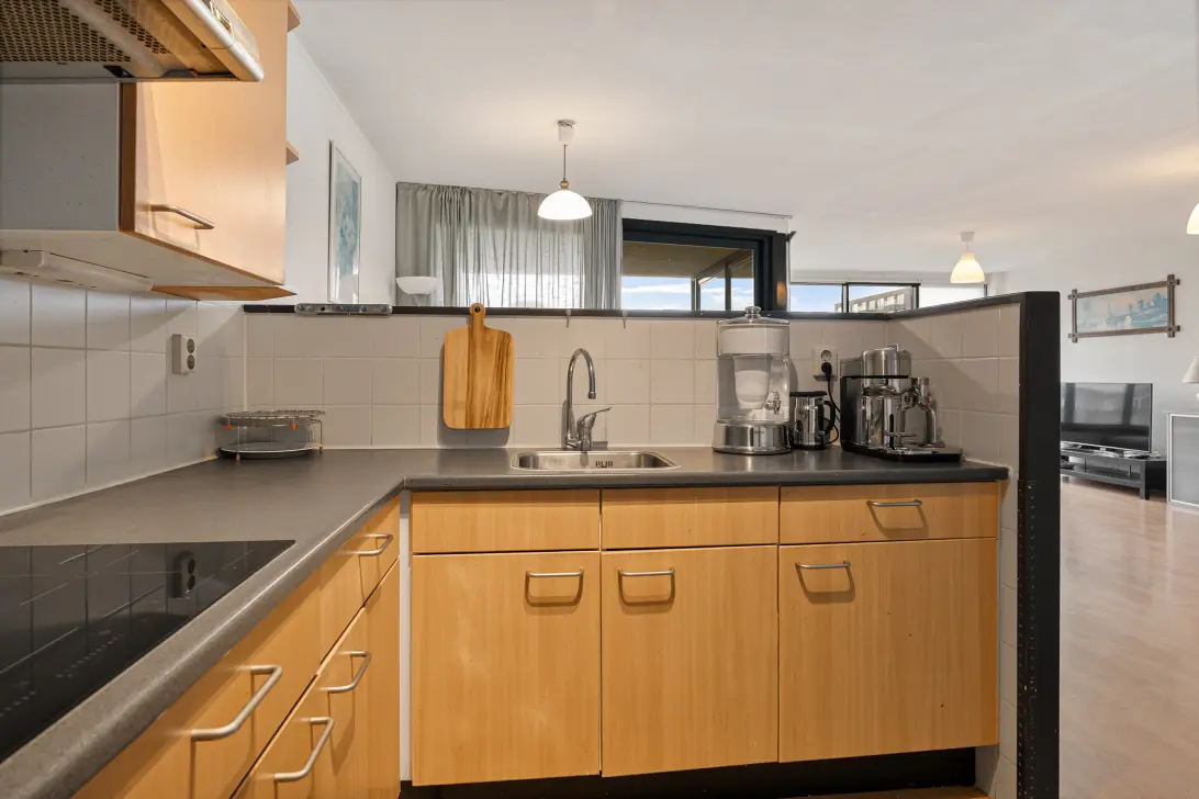 De lichte woonkamer is royaal opgezet en biedt volop ruimte voor een comfortabele zithoek en een grote eettafel. Dankzij de grote raampartijen geniet je hier van een vrij uitzicht over het stadspark en veel daglicht. Aansluitend vind je de open keuken in hoekopstelling, voorzien van een combi magnetron/oven, inductiekookplaat en apothekerskast. Vanuit de keuken bereik je de bijkeuken met aansluitingen voor wasmachine en droger en extra bergruimte.