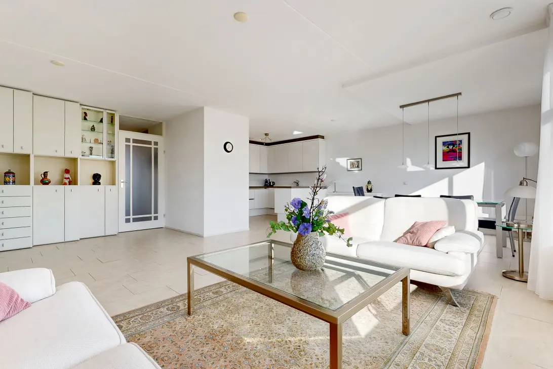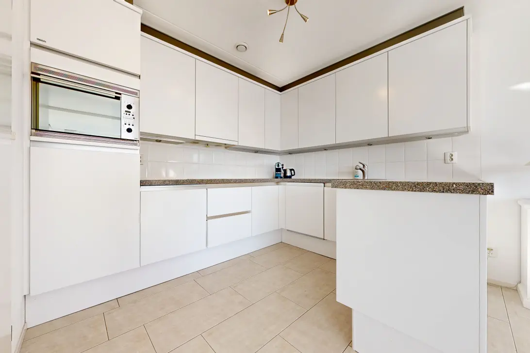 Het appartement beschikt over een aangename lichte woonkamer voorzien van een lichtbeige tegelvloer en open keuken. Vanuit de woonkamer heeft u een levendig en prettig uitzicht.
