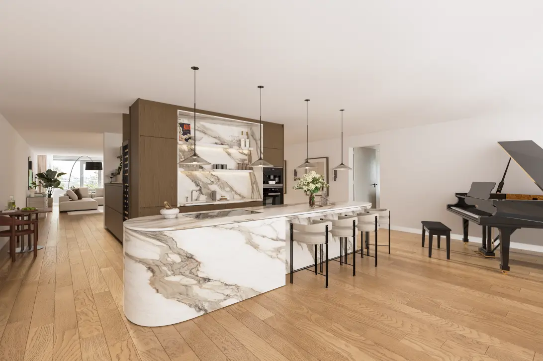 De woonkamer en eetkamer beslaan samen ca. 97 m² en vormen het hart van het appartement. Dankzij de grote raampartijen is het hier heerlijk licht. Jaloezieën zijn elektrisch bedienbaar, airconditioning en vloerverwarming zorgen het hele jaar door voor een aangenaam binnenklimaat.