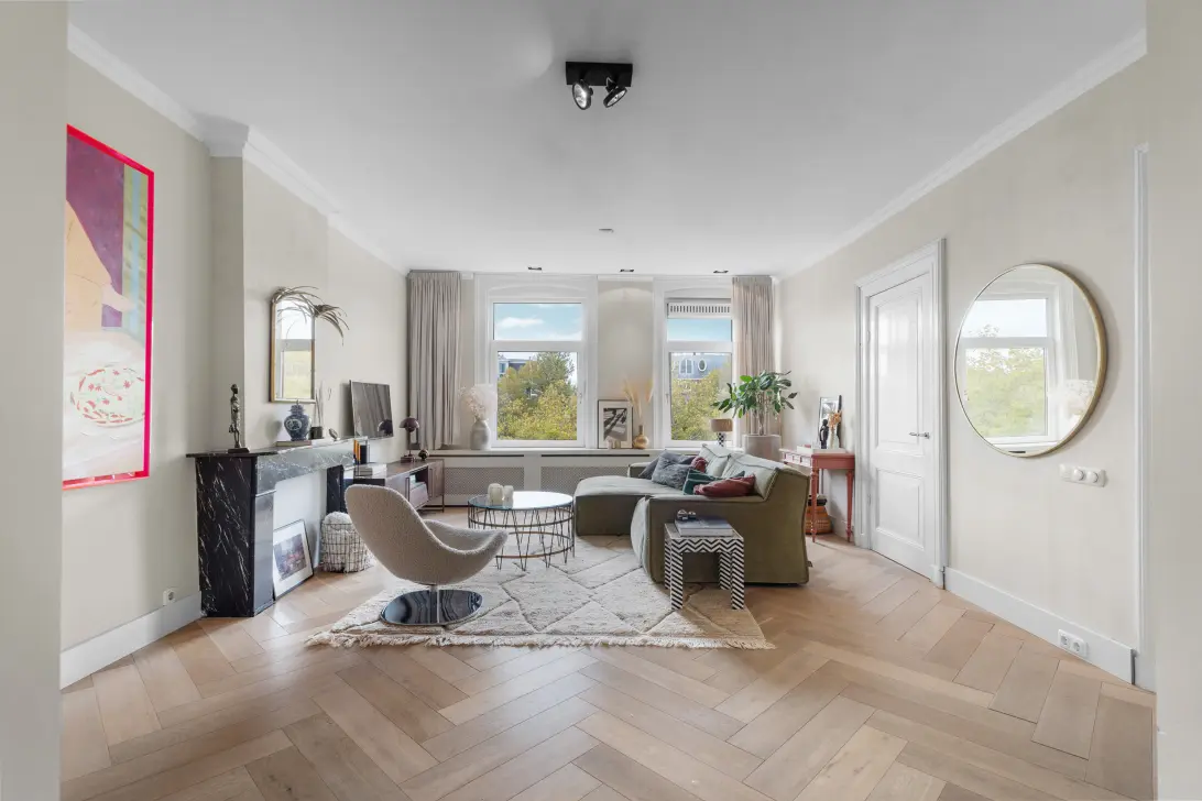 Het appartement is onder andere voorzien van een fraaie visgraat parket vloer, originele marmeren schouw , hoge plafonds ( 2.65 m), moderne keuken met inbouwapparatuur en een moderne ruime badkamer.