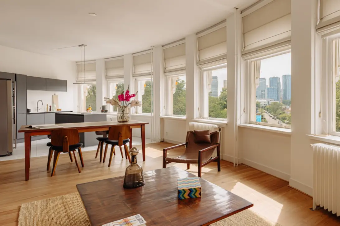 Dit bijzondere appartement strekt zich uit langs een gebogen gevel met maar liefst acht ramen, die een panoramisch uitzicht bieden op het groen van de Stadionkade en de skyline van de Zuidas. De royale leefruimte wordt verlicht door daglicht vanuit meerdere richtingen en vormt een elegante setting waarin de moderne, open keuken centraal staat. Deze is uitgerust met een kookeiland, BORA-inductie, Siemens apparatuur en een Amerikaanse koelkast. Verspreid over drie verdiepingen bevinden zich drie volwaardige slaapkamers, elk met een eigen sfeer en indeling. Er zijn twee stijlvolle badkamers, waarvan één met ligbad, dubbele douche en dubbel wastafelmeubel. De bovenste slaapkamer beschikt over een en suite badkamer en directe toegang tot het charmante dakterras op het oosten — een rustige buitenruimte met uitzicht over de daken van Zuid, ideaal voor een vroege koffie in de ochtendzon.