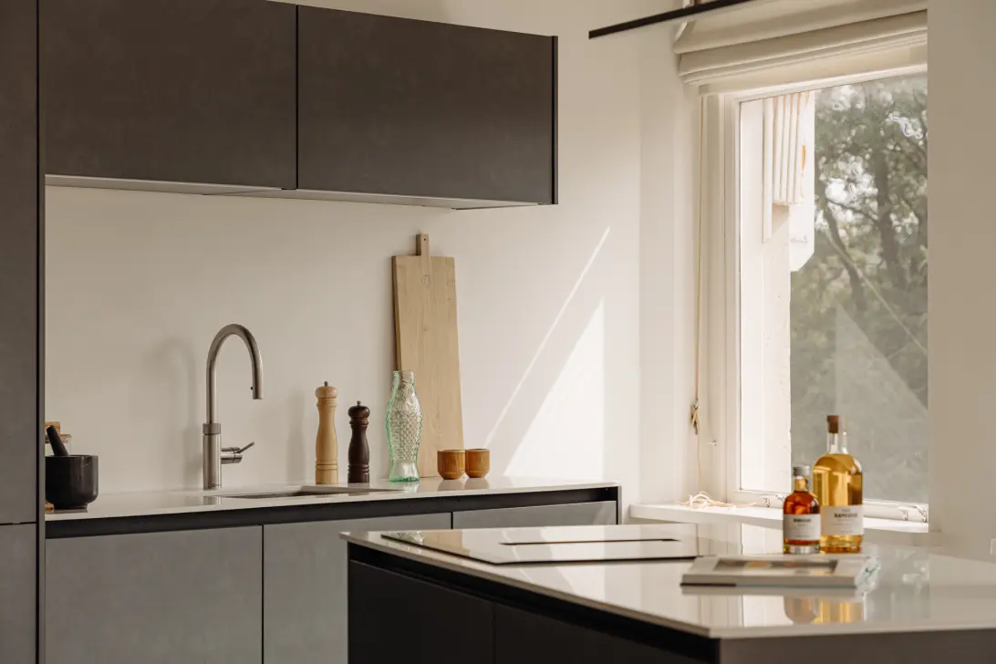 This distinctive apartment extends along a curved façade with no fewer than eight windows, offering panoramic views of the greenery of Stadionkade and the skyline of the Zuidas. The spacious living area is illuminated by daylight from multiple directions and forms an elegant setting with the modern open kitchen at its centre. It is equipped with a cooking island, BORA induction, Siemens appliances and an American refrigerator. Spread across three levels are three full-sized bedrooms, each with its own atmosphere and layout. There are two stylish bathrooms, one of which includes a bathtub, double shower and double washbasin. The top-floor bedroom features an en suite bathroom and direct access to the charming east-facing roof terrace — a tranquil outdoor space with views across the rooftops of Zuid, ideal for enjoying a morning coffee in the early sun.