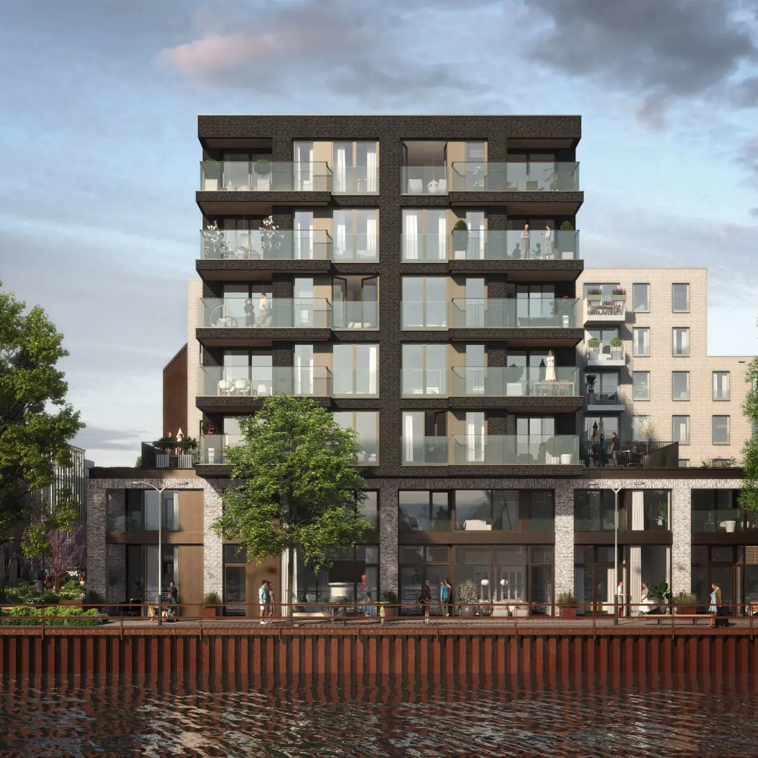 Langs de kade komen royale stadswoningen met een eigen entree aan het water. Je woont hier met het comfort van nieuwbouw, maar met het gevoel van een huis aan de gracht. De hoge plafonds, grote ramen en open leefkeuken zorgen voor een lichte en ruimtelijke woonbeleving.