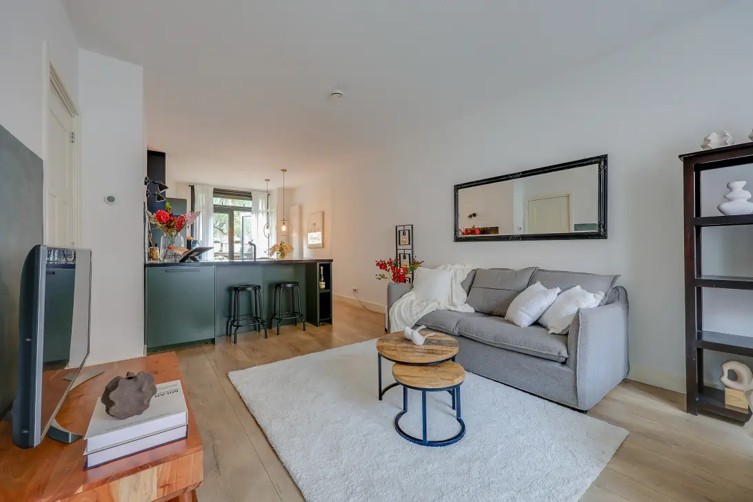 De ruime woonkamer met open keuken vormt het hart van het huis en heeft directe toegang tot het zonnige balkon op het zuiden – dé plek voor een kop koffie in de ochtendzon of een borrel in de avond.