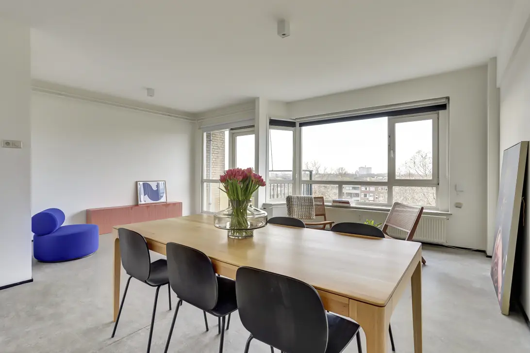 Aan de achterkant zijn er houten kozijnen met enkele beglazing. Aan de voorzijde heeft men tevens mooi uitzicht over de brede groene straat. De wanden zijn voorzien van sierlijsten en afgewerkt in het lichtgrijs, donkergrijs en wit.