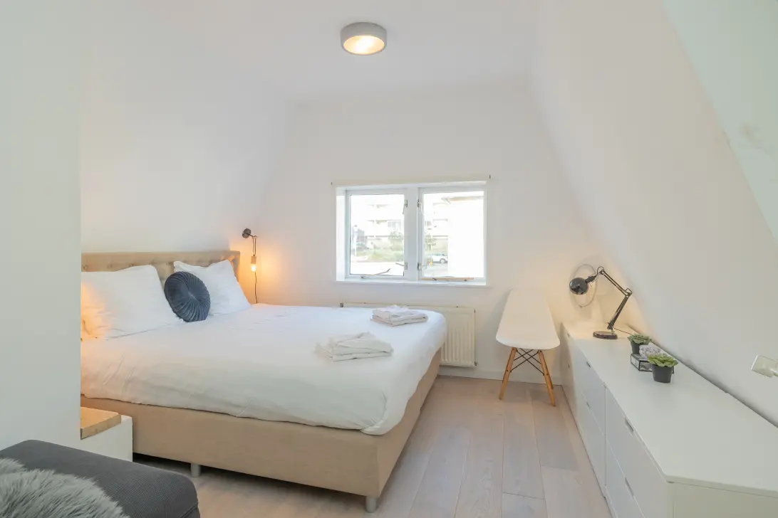 1e verdieping: op deze etage bevinden zich de 2 slaapkamers en de badkamer. De 1e slaapkamer heeft een eveneens een houten vloer en een groot Velux raam. Slaapkamer 2 ligt aan de achterzijde met een houten vloer, vaste kast, groot Velux raam en openslaande deuren naar knus balkon op het zonnige westen.