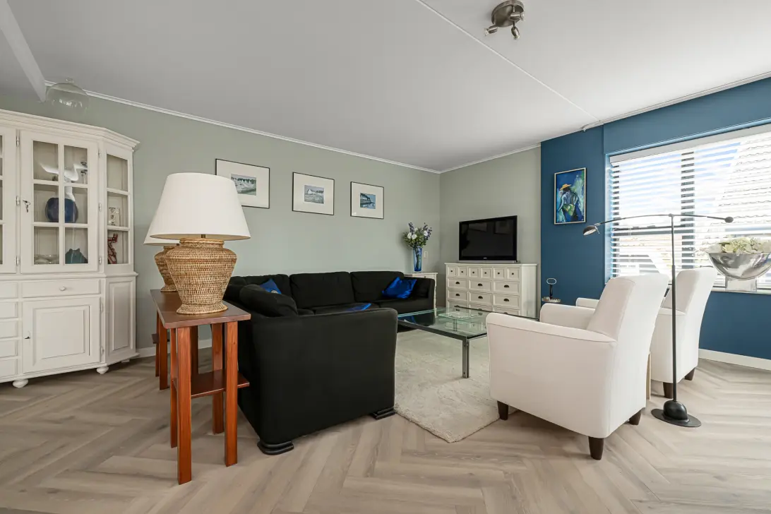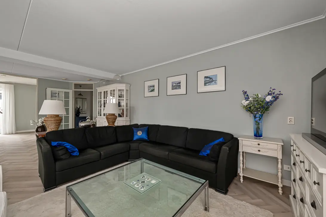 De riante woonkamer vormt het hart van de woning: licht, ruim en met openslaande deuren naar het Franse balkon. De open keuken in U-opstelling sluit hier naadloos op aan en biedt volop werk- en bergruimte.