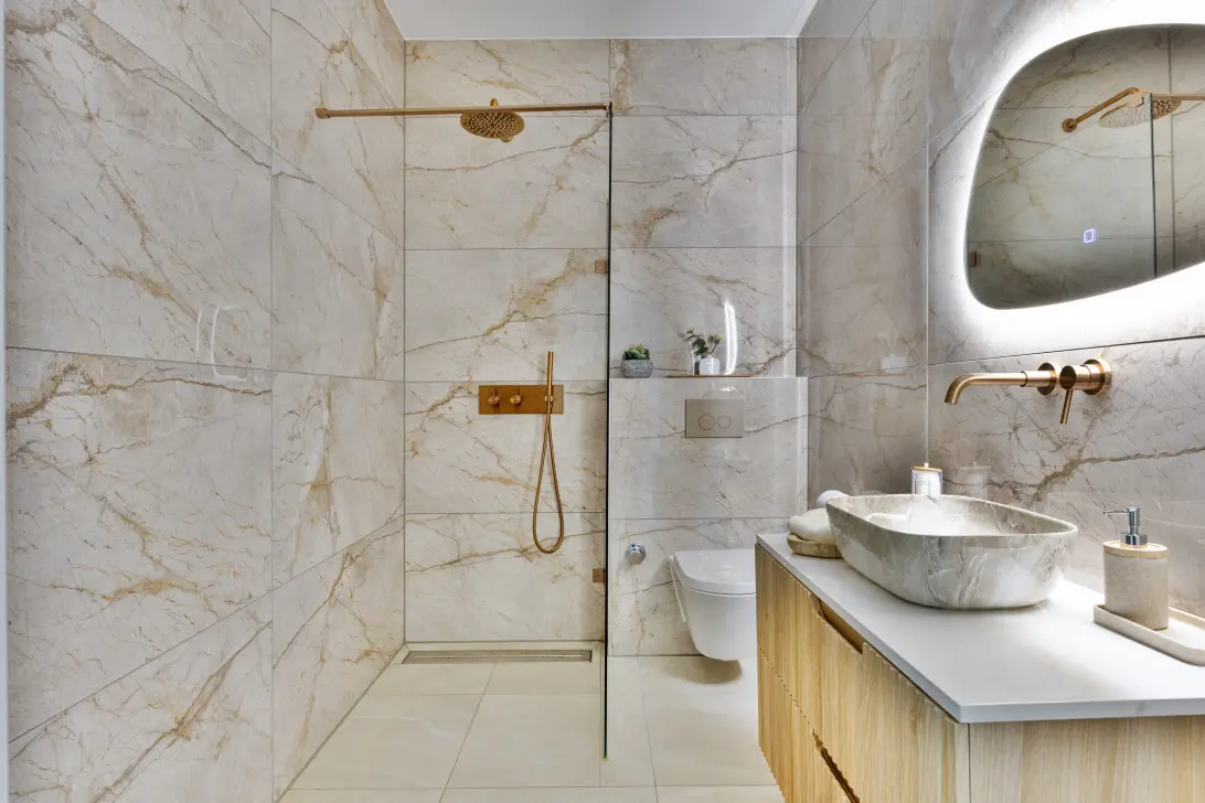The bathroom on the first floor is beautifully finished, featuring a spacious walk-in shower, modern washbasin unit, and high-quality materials. Conveniently, every floor also has a separate toilet – a practical feature for larger families.