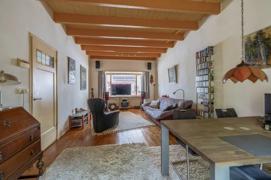 In de meer dan 7 meter lange woonkamer wordt de sfeer bepaald door het hoge balkenplafond, de erker en de houten vloer. Het zitgedeelte is aan de voorzijde, en aan de achterzijde is het eetgedeelte met openslaande deuren naar de tuin. Vanuit de woonkamer is de keuken te bereiken, met dezelfde tegelvloer als in de hal en toiletruimte. De lichte keukenopstelling heeft een aanrechtblad van hardsteen en de gaskookplaat, afzuigkap, koelkast en vriezer blijven achter.