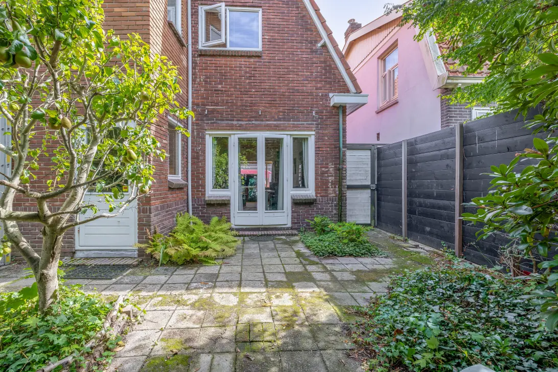 De achtertuin, met een eigen achterom, is bereikbaar vanuit de woonkamer en keuken. Het vele groen zorgt voor privacy, en de ligging op het zuiden is interessant voor de zonliefhebber. Erg handig, er is een eigen achterom naar de rustige Steijnstraat.