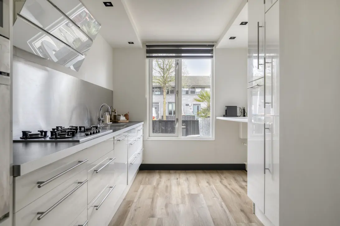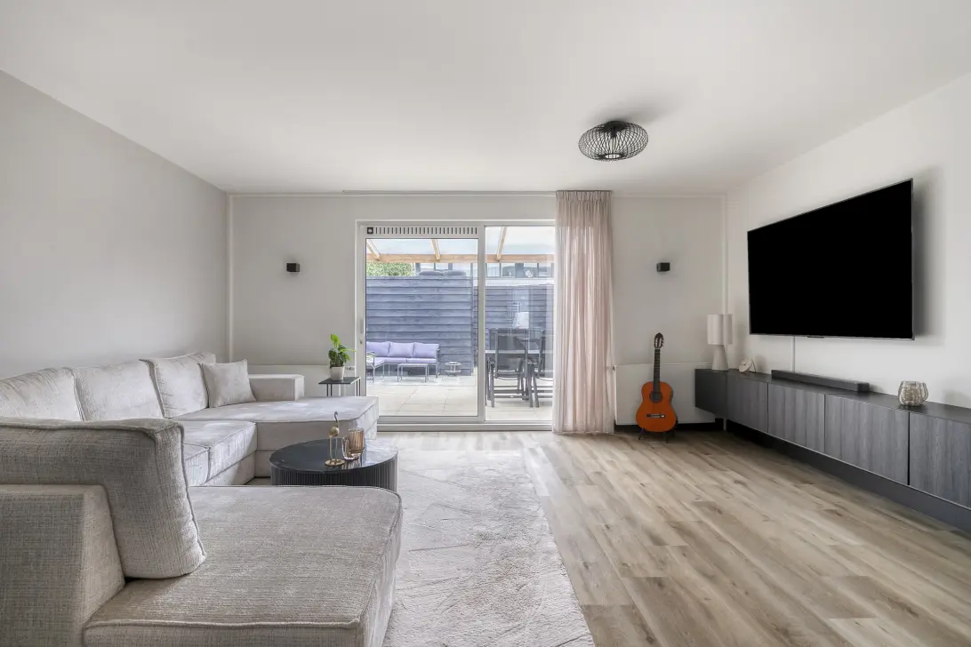Via de verzorgde voortuin stap je de woning binnen, vanuit hier heb je toegang tot een ruime provisieruimte, toilet en trapopgang. Bij binnenkomst in de woonkamer valt direct het vele daglicht op dankzij de grote raampartijen. De woonkamer is zo'n 30m2 groot en er is voldoende ruimte voor een comfortabele zithoek en een grote eettafel om gezellig met vrienden of familie aan te kunnen borrelen/dineren. Aangrenzend aan de woonkamer bevindt zich de open keuken. Modern ingericht in een lichte kleurstelling welke voorzien is van: een 5-pits gasfornuis, een oven, een magnetron, een vaatwasser, een koel-vriescombinatie en bovendien voldoende opbergruimte voor al het keukengerei. Voor de afwerking van de begane grond is gekozen voor strak gestucte wanden in een lichte kleur en een PVC vloer met een warme houtlook.