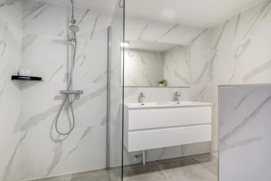 De badkamer is werkelijk een pareltje! Deze is vernieuwd en voorzien van: een inloopdouche, een tweede toilet en een dubbele wastafel met wastafelmeubel. Voor de afwerking van de badkamer is gekozen voor lichte tegels op de wanden met een marmeren uitstraling en een lichtgrijze tegelvloer.