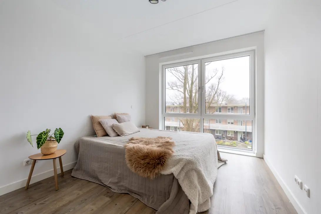 De slaapkamer ligt, net als de woonkamer, aan de rustige kant van het appartement. Jij slaapt dus altijd lekker met het raam open. Dankzij de fijne ligging kijk je uit op het groen. De badkamer ligt er direct naast en is voorzien van een moderne inloopdouche, wastafelmeubel en toilet. Alles netjes afgewerkt en fris in uitstraling.