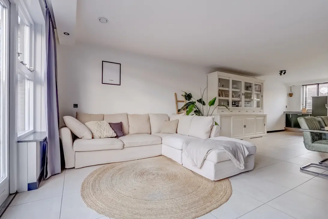 De ruime woonkamer en keuken bieden een fijne en lichte plek om samen te komen. De grote openslaande deuren naar de tuin zorgen voor veel natuurlijk lichtinval en een open sfeer.