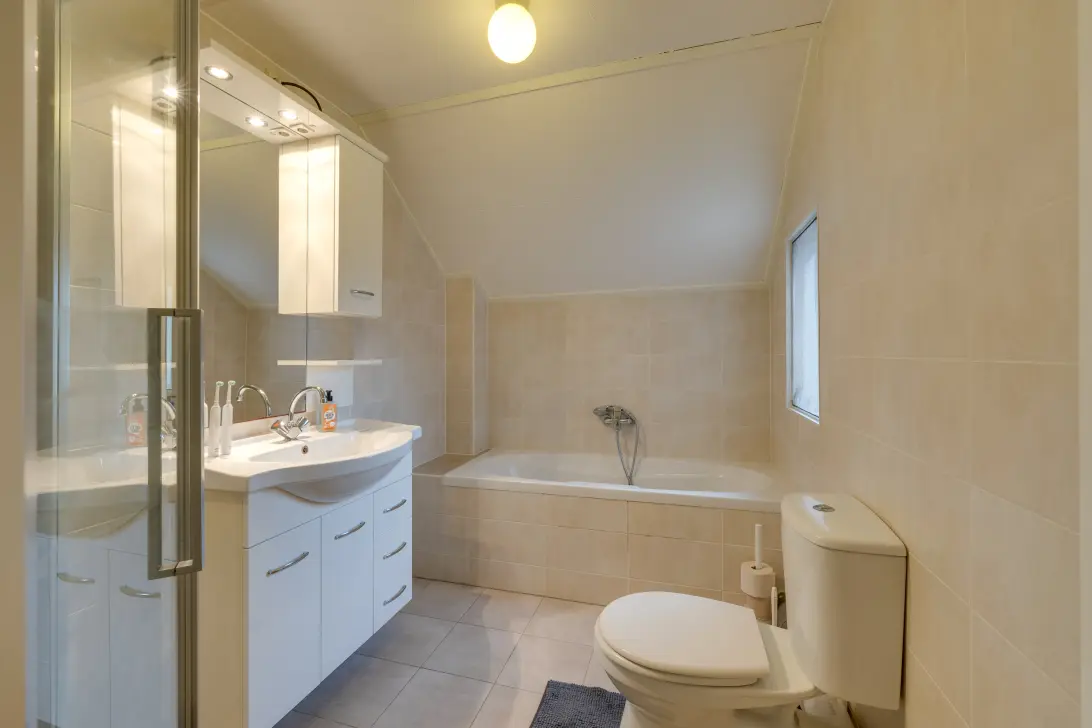 1e verdieping: Overloop met inbouwkast, achterslaapkamer met kunststof dakkapel, achterslaapkamer voorzien van kunststof dakkapel met rolluik, voorslaapkamer en een luxe betegelde badkamer voorzien van badmeubel, toilet, douche en ligbad.