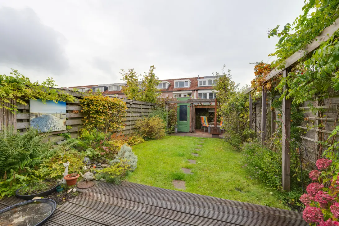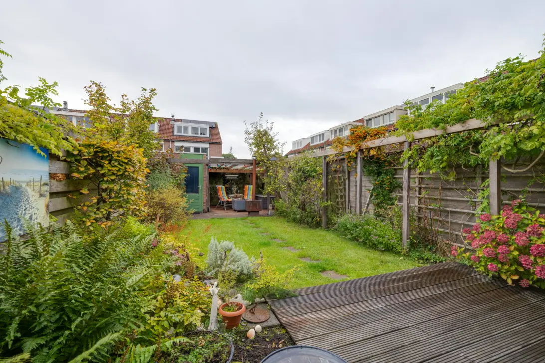voortuin met een parkeerplaats, - een tweede plek is ook mogelijk! - entree woning met de hal, meterkast, toilet en trapopgang naar de eerste verdieping. Vanuit de hal kom je de woonkamer binnen en dankzij de grote kunststof pui met openslaande deuren (en hordeur!) in de achtergevel en de open verbinding met de keuken profiteer je van een aangename lichtinval in de woonkamer. De fraaie houten afwerkvloer, de strakke wanden en rustige pastel kleuren leggen alvast een uitstekende basis voor het doorvoeren van jouw woonwensen. De luxe U-vormige inbouwkeuken aan de voorzijde met kwalitatief hoogwaardige Neff inbouwapparatuur o.a extra grote ijskast en extra grote vriezer, inductiekookplaat, stoomoven, combioven en vaatwasser, biedt veel handige kast- en werkruimte. Ook praktisch: extra voorraad kan je ook nog kwijt in de handige trapkast. Door die al genoemde dubbele deuren bereik je de fraai aangelegde tuin met berging, gezellige overkapping en achterom.