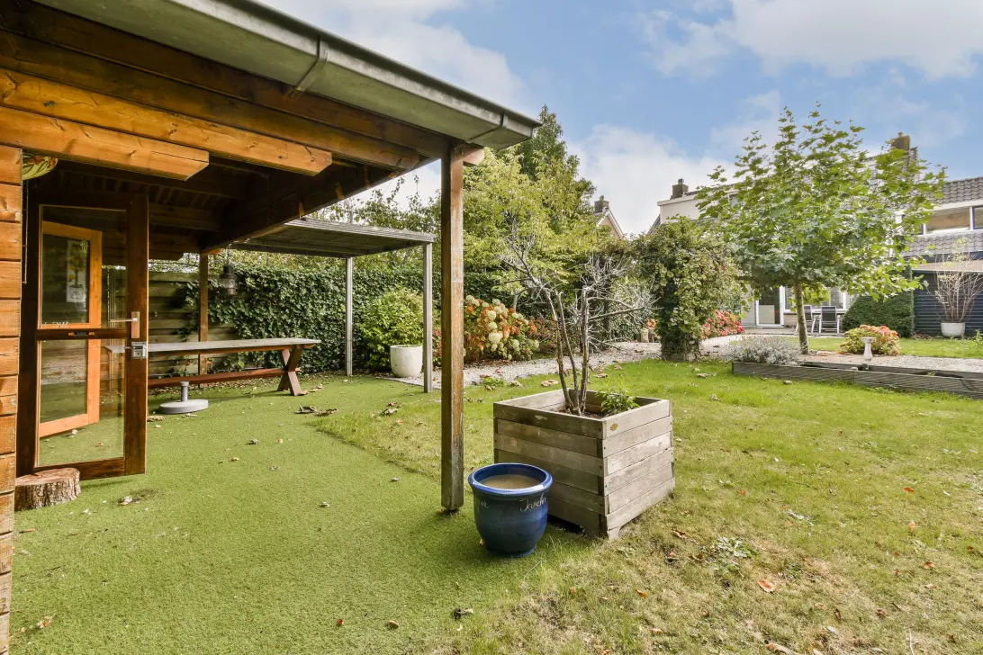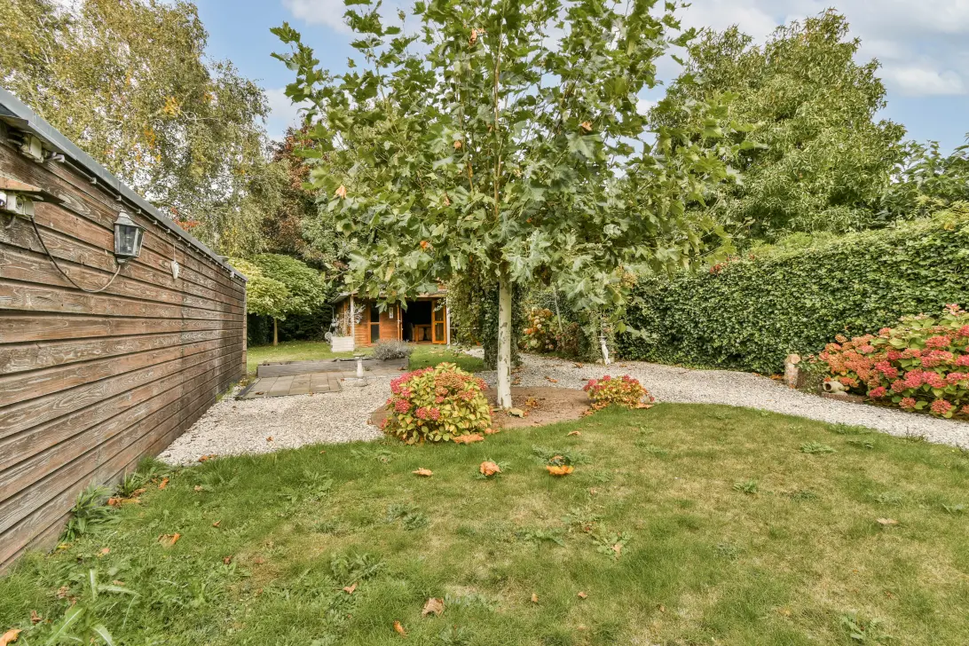 Altijd een plek voor zon of schaduw – precies wat je wilt. De tuin is bereikbaar vanuit zowel de woonkamer als de garage en beschikt over een ruime houten berging voor fietsen of scooters.