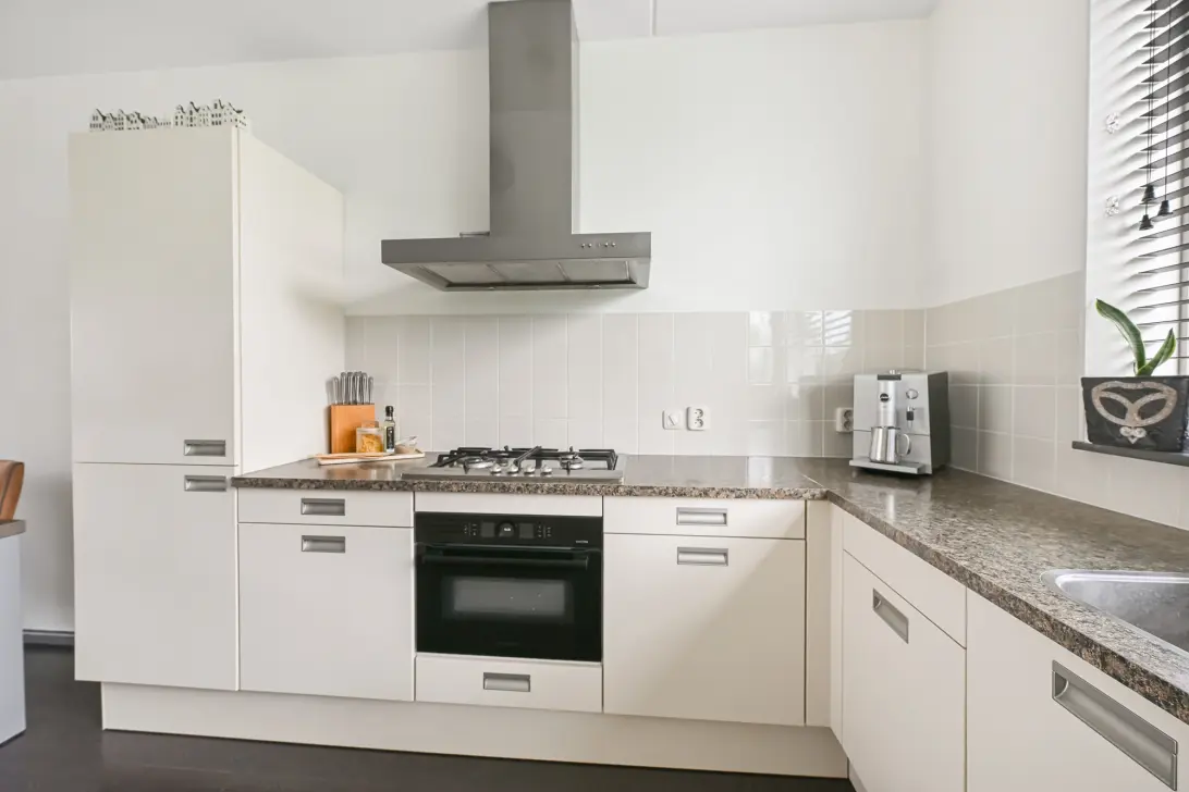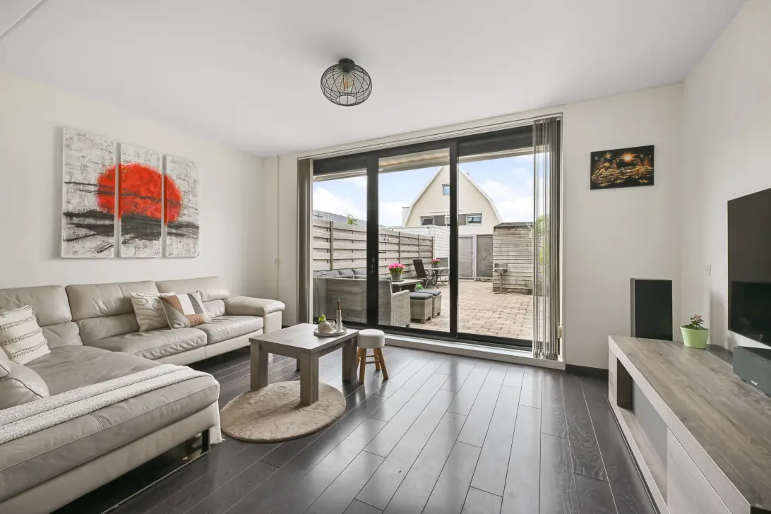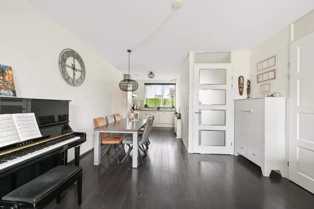 Zodra je binnenstapt, valt direct de breedte van de woning op — dit zorgt voor een aangenaam ruimtelijk gevoel. De woonkamer is voorzien van een grote schuifpui naar de tuin, waardoor het daglicht rijkelijk naar binnen stroomt. De fijne zithoek maakt dit tot een heerlijke plek om te ontspannen. Aan de voorzijde bevindt zich de verzorgde keuken met uitzicht op het fietspad. Deze is voorzien van inbouwapparatuur, die door de jaren heen is vernieuwd. Dankzij de rustige ligging ervaar je hier veel privacy tijdens het koken.