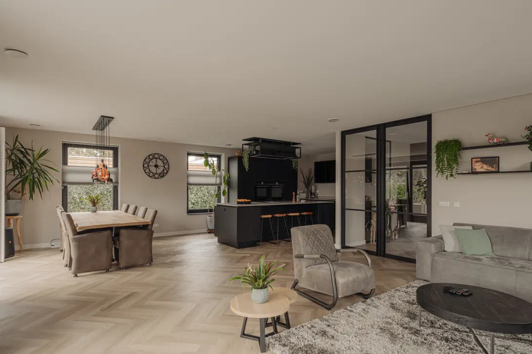 Vanuit de hal kom je via dubbele deuren in de royale woonkamer met open keuken. De woonkamer is voorzien van veel lichtinval door de ramen aan de voor- en achterzijde. De prachtige open keuken is uitgerust met een centraal kookeiland en een moderne opstelling met inbouwapparatuur. Achter de keuken bevindt zich een praktische bijkeuken met aansluitingen voor was apparatuur en een extra opbergkast. Middels de openslaande deuren heeft u toegang tot de tuin en het terras.