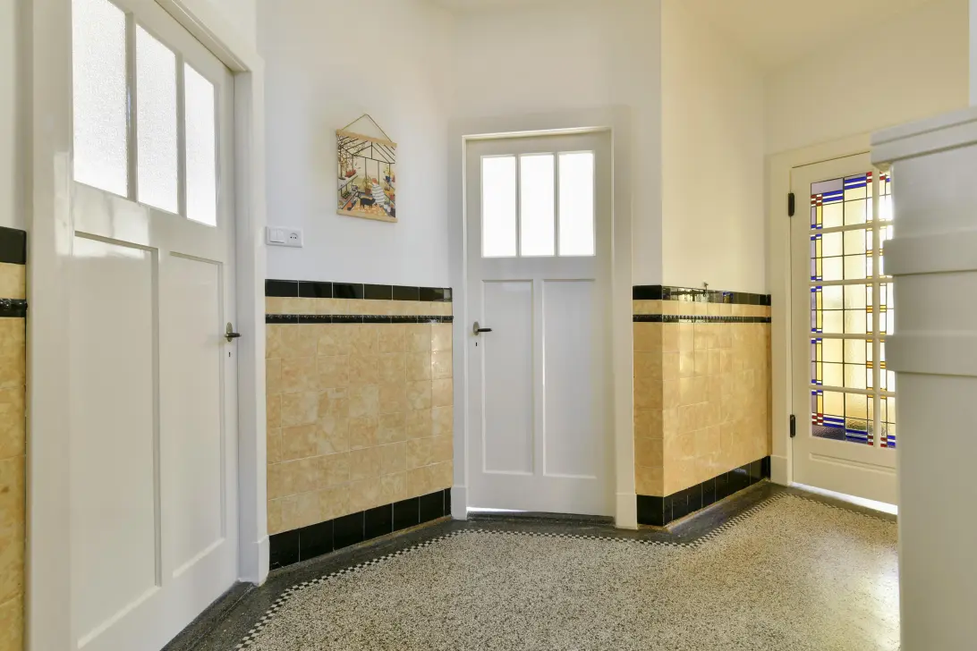 As soon as you step inside, you are greeted by the charm of this 1930s house. The entrance of the house is a feast for the eyes with beautiful stained glass windows that let colorful light in and a stunning granito floor and fine paneling. These authentic details create a warm and inviting atmosphere that immediately gives you a sense of home. The stylish hall and staircase serve as the perfect introduction to the rest of the house.
