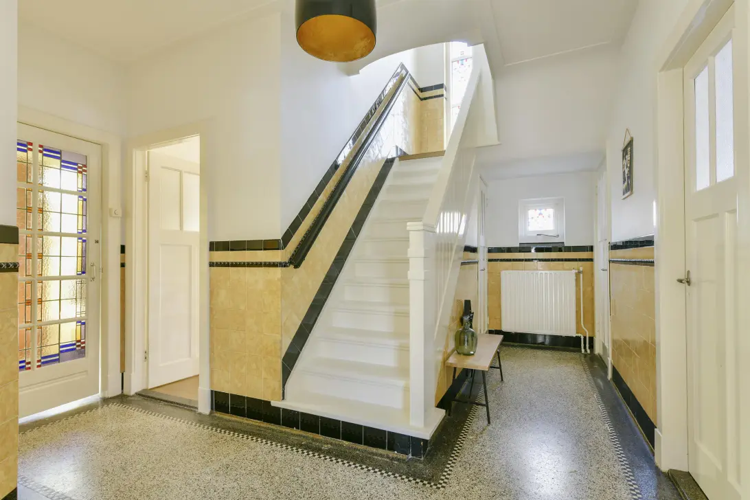Zodra je binnenstapt, word je begroet door de charme van dit jaren '30 huis. De entree van de woning is een lust voor het oog met prachtige glas-in-loodramen die kleurrijk licht naar binnen laten vallen en een schitterende granito vloer en fraaie lambrisering. Deze authentieke details zorgen voor een warme en uitnodigende sfeer die je direct een gevoel van thuis geeft. De stijlvolle hal en trapopgang fungeert als de perfecte introductie tot de rest van het huis.